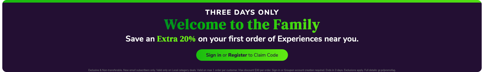 Exclusive & non-transferable. New Customer Only. Valid only on Local category deals. Valid on max 1 order per customer. Max discount $30 per order. Limited to first time purchasers only. Ends in 3 days. Exclusions apply. Full details: gr.pn/promofaq.